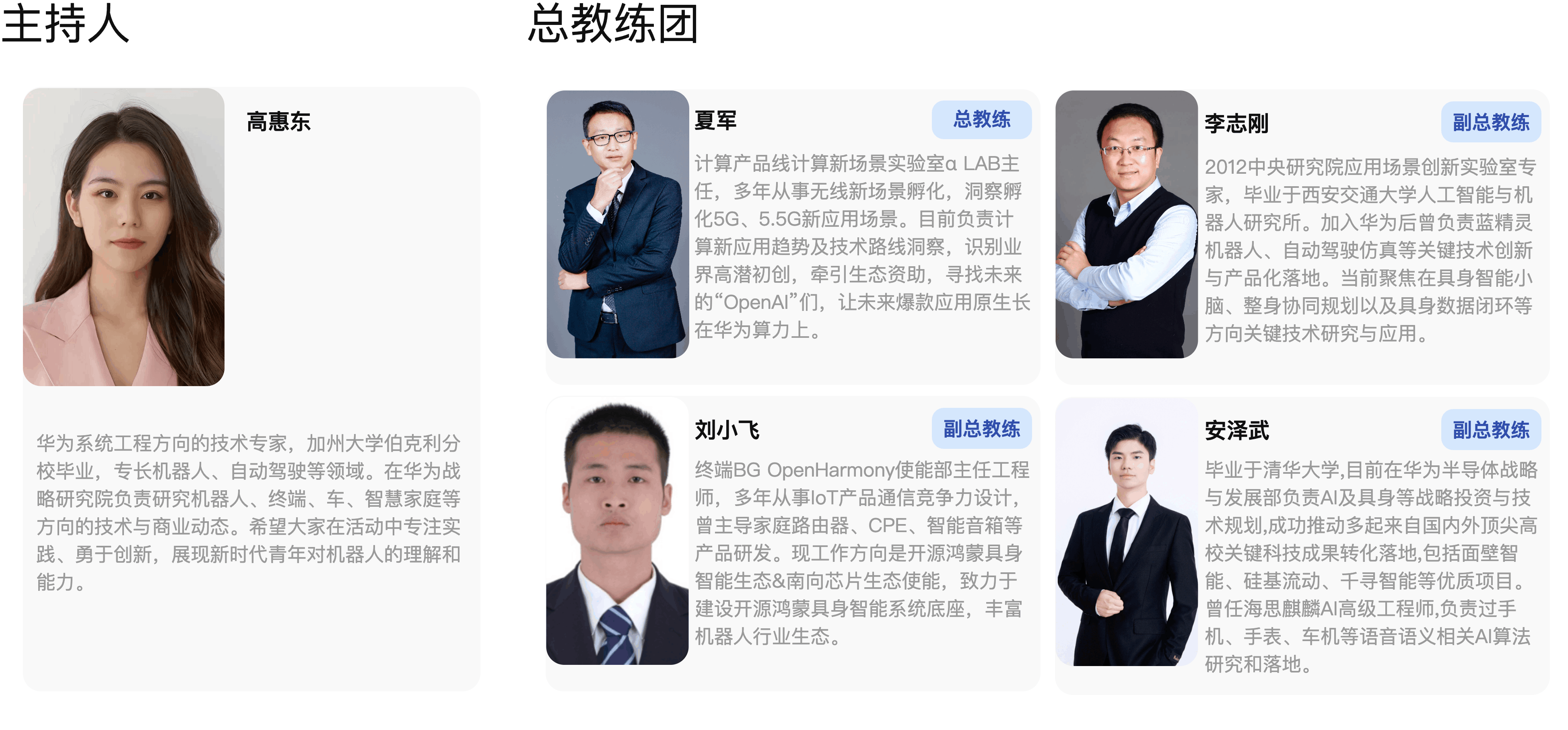 华为海思AI与机器人系统架构师。对技术创新保持始热忱好奇。热爱并从事机器人、智能硬件、自动化设备的设计开发与应用。期待选手们碰撞灵感,挑战极限,共探机器人技术的无限可能。