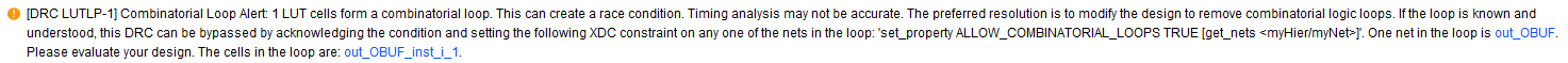 组合逻辑环路警告:1个LUT单元形成了组合循环环路。这可能会造成竞争条件。时序分析可能会不准确。推荐的解决方案是修改设计以去除组合逻辑环路。如果组合逻辑环路是已知的预期设计,则可以通过确认条件并在循环中的任何一个网络上设置以下XDC约束来绕过此DRC:“set_property ALLOW_COMBINATORIAL_LOOPS TRUE[get_nets<myHier/myNet>]”。