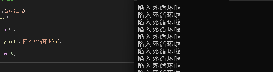 循环语句有一个常见的错误那就是陷入死循环,即条件为永真,循环一直不停止,下列就是一种简单的死循环: