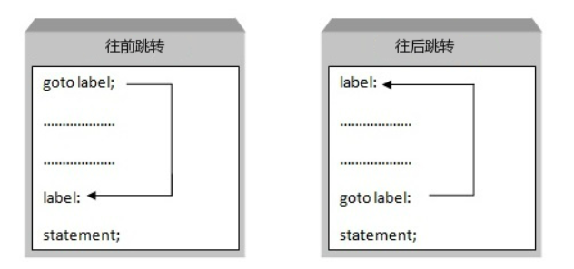 - 在这里,label 可以是任何除 C 关键字以外的纯文本,它可以设置在 C 程序中 goto 语句的前面或者后面。