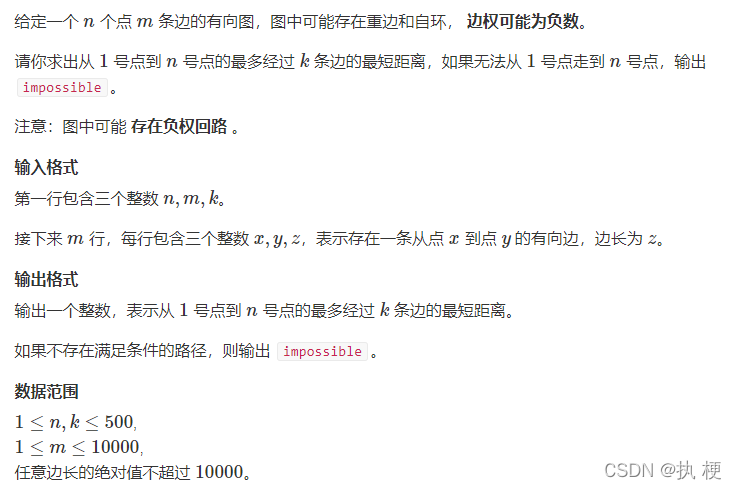 大家好啊,我是执梗。今天是零基础学算法一百天的第2天,本次我们讲解的是bellman-ford算法。上一次我们提到了最短路算法是有好几种的,不同的算法不仅适用的场景不同,而且复杂度也不同,选择不适很可能会MLE或TLE,今天我们讲解的是bellman-ford算法,这还是非常重要的,模板非常容易记下来。