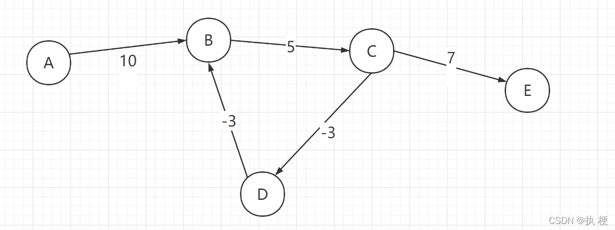 如图这种情况,如果计算从A点到E点的距离,由于BCD是形成了一个负环,每循环一次权值就-1,所以如果循环无数圈就是负无穷,结果得到到E的最短距离是负无穷。但是大家不要担心,一般题目都不会出现这种情况,会说明,只不过大家要知道有这种情况产生。