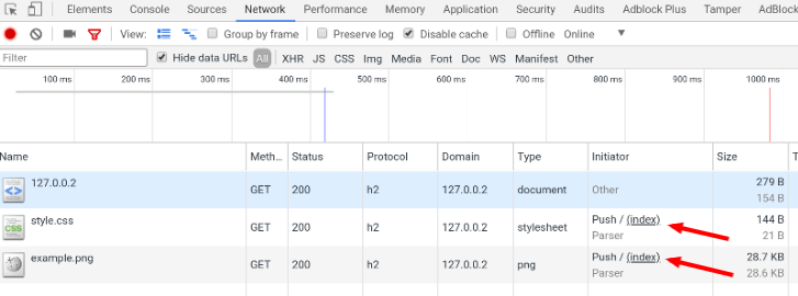 网页上看不出来服务器推送,必须打开"开发者工具",切换到 Network 面板,就可以看到其实只发出了一次请求,style.css和example.png都是推送过来的。
