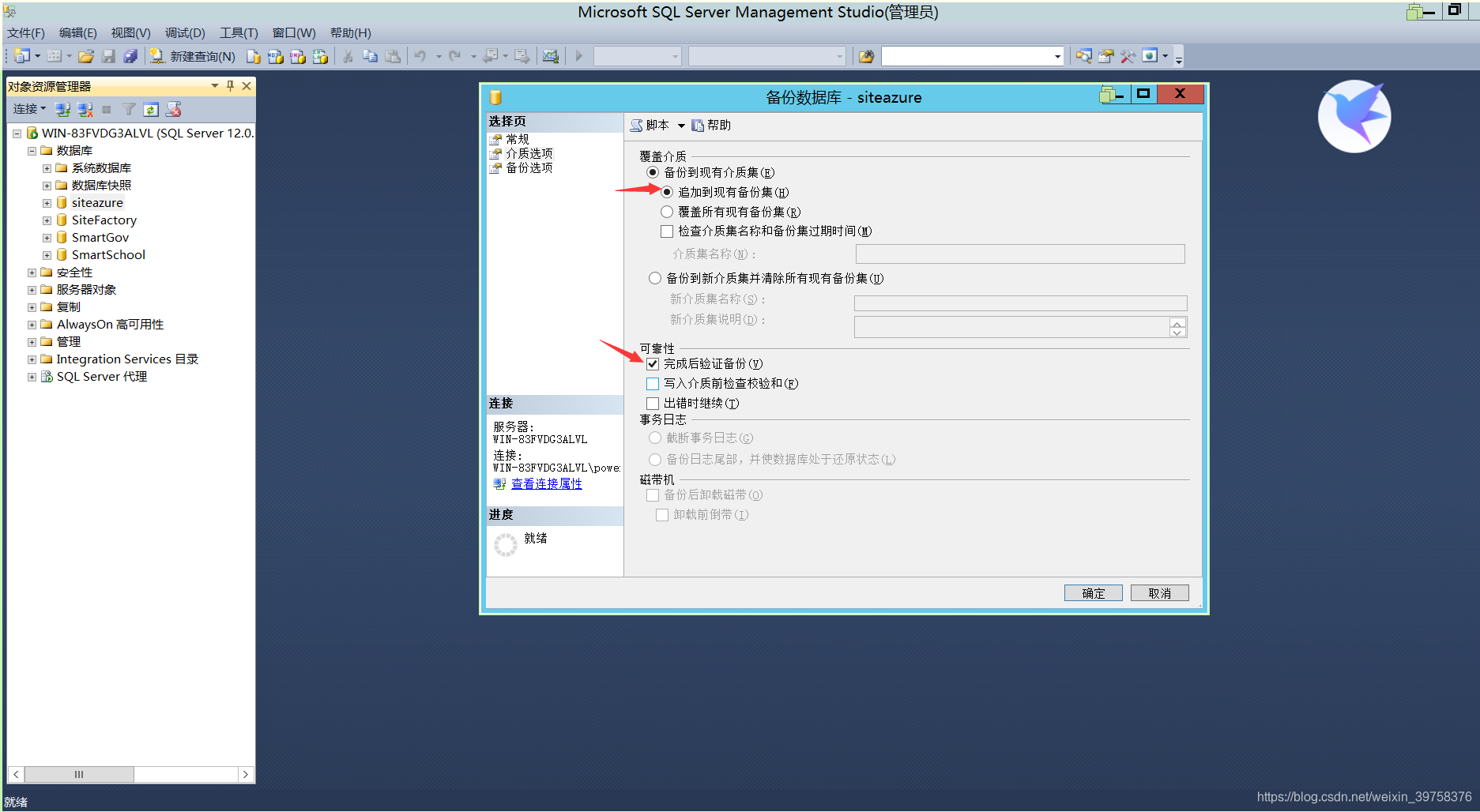 3.在介质选项中尽量选择追加,备份完成后先择验证