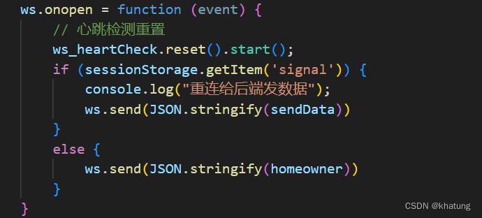 重新连接后会调用ws.onopen,在里面判断本地是否存的有那个“signal”数据包,有的话就表示是断线重连后给后端发数据包,这个数据包的类型需要跟后端那边协商,后端要判断接受的数据包类型