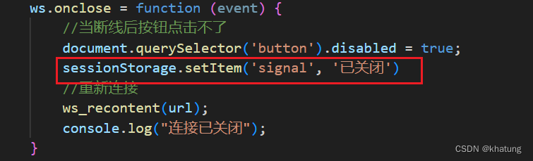 3、当websocket关闭或者有错误时,在本地随便存一个数据用来判断,并且重新连接