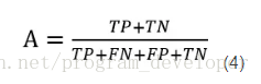 精确度(Accuracy),缩写表示用A。精确度则是分类正确的样本数占样本总数的比例。Accuracy反应了分类器对整个样本的判定能力(即能将正的判定为正的,负的判定为负的)。定义公式如4所示。