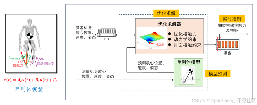 一、模型预测控制(MPC):基于单刚体模型,通过动态优化,在未来一定的时间内预测和优化系统行为,其控制过程包括模型预测、优化求解和实时控制。在模型预测阶段,通过测量机器人的状态(如机身位置、速度和角速度),结合单刚体模型,预测出一个时间序列内的机身状态。将这些参考状态与实际测量值输入优化求解器,并结合约束条件,求得一段时间内的控制指令。选取第一个控制指令作为期望的末端接触力与力矩,再输入到下一个控制模块——内部多关节系统控制中。