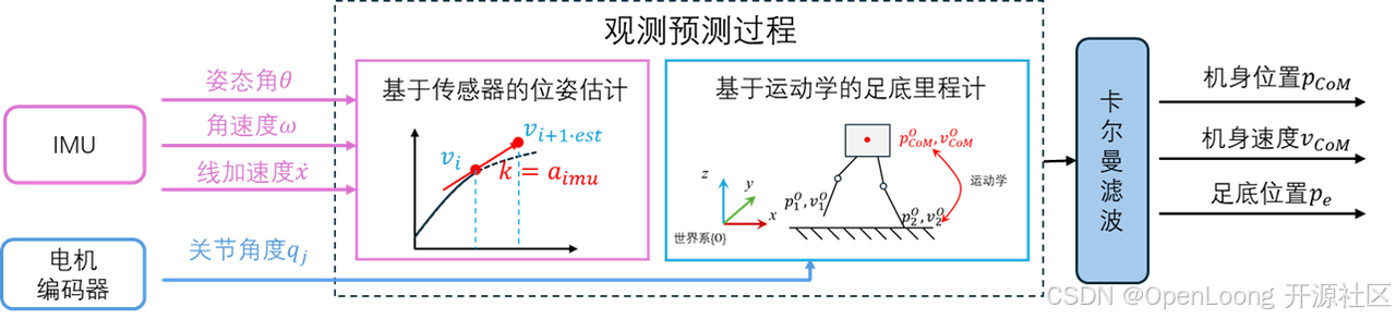 三、基于卡尔曼滤波的状态估计:状态估计结合传感器测量数据与运动学信息,在存在噪声的情况下,应用卡尔曼滤波融合预测值和测量值来获得当前机身状态。状态估计在实物部署里面是非常重要的,因为仿真其实是可以获取仿真引擎里面的位置速度,但是实物获取不了,只能通过状态估计获取。状态估计对最后的控制效果影响还是非常大的,虽然团队开源的是仿真,但是在 OpenLoong 项目的动力学仓库低阻尼分支上,团队也把状态估计算法开源上去了,大家也可以下载测试一下。