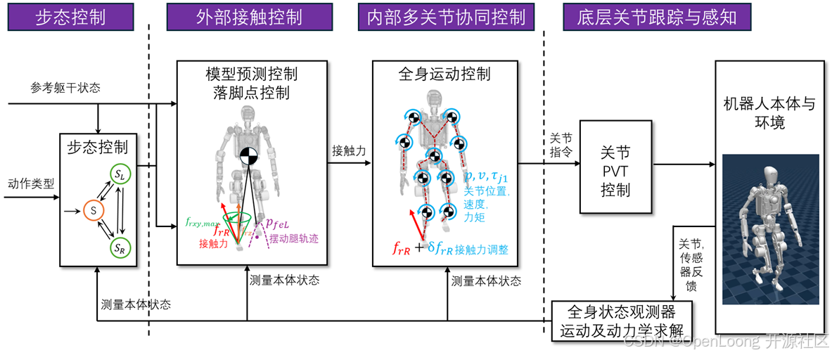 通常的运动控制算法框架分为以下几个部分,首先是外部接触控制,主要是依靠 MPC 还有落脚点的规划进行末端的接触力和末端轨迹的求取;然后输入到内部多关节协同控制当中,依托 WBC 在进行关节的速度位置依据指令的计算。最后是底层关节跟踪与感知模块,能够计算出机器人最终需要的依据指令,并且这个模块当中还有状态估计,能够获取机器人的状态,为前面的控制模块提供反馈。